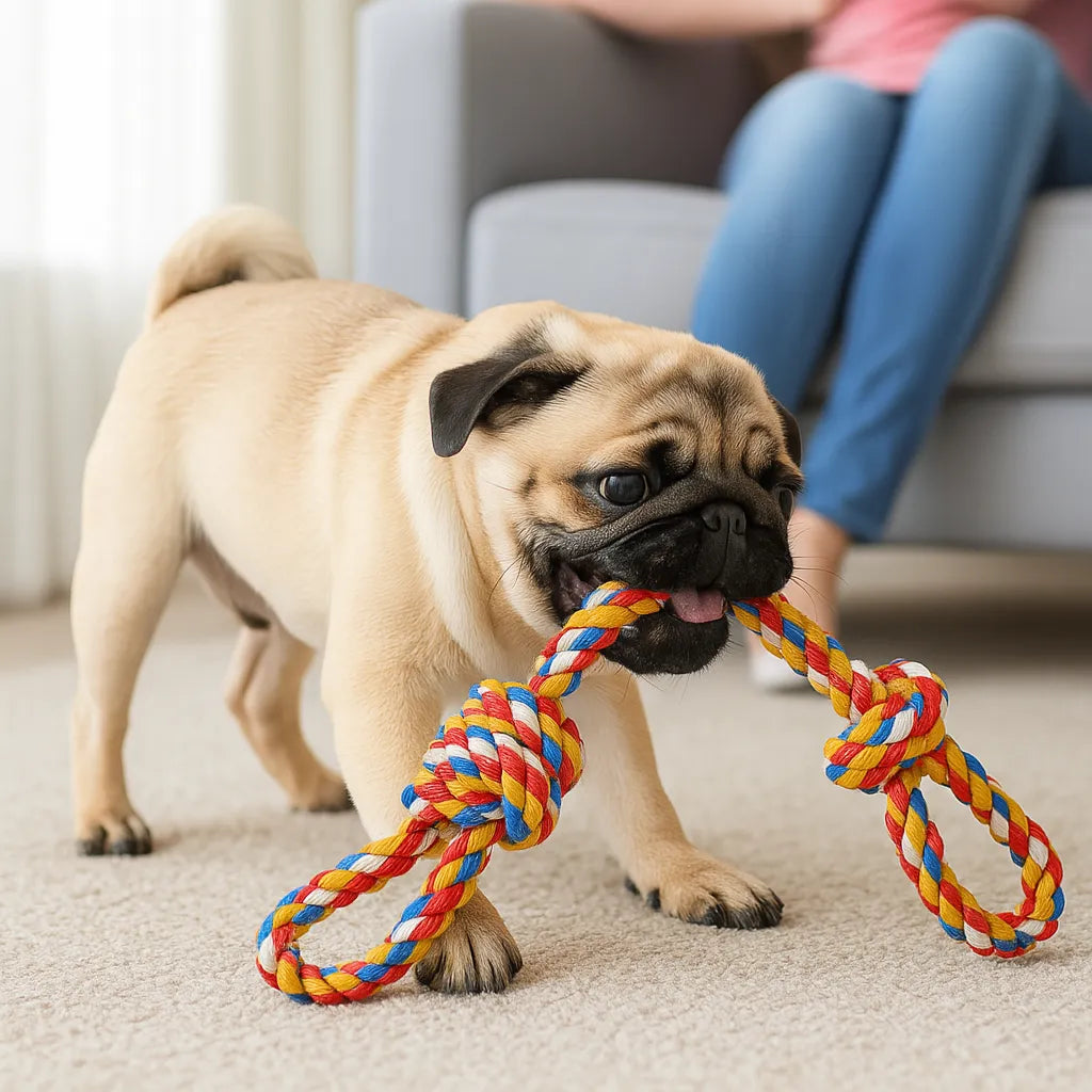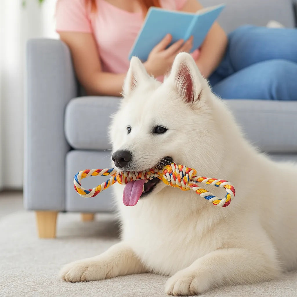 Esse produto é uma corda robusta de 48cm feita com algodão natural trançado, perfeita para cães médios e grandes que adoram puxar, mastigar e brincar com intensidade. Além de resistente, ela contribui para a higiene bucal e alivia o estresse do seu cãozinho de forma natural e segura.